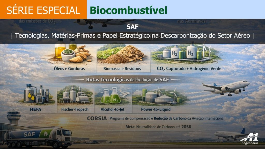 O Combustível Sustentável de Aviação (SAF – Sustainable Aviation Fuel) refere-se a combustíveis líquidos produzidos a partir de matérias-primas renováveis, capazes de substituir parcial ou totalmente o querosene de aviação de origem fóssil (Jet A-1). A principal característica técnica do SAF é sua condição de combustível “drop-in”, ou seja, ele pode ser utilizado em aeronaves comerciais existentes sem necessidade de modificações nos motores, sistemas de combustível ou na infraestrutura aeroportuária (EASA, 2025).